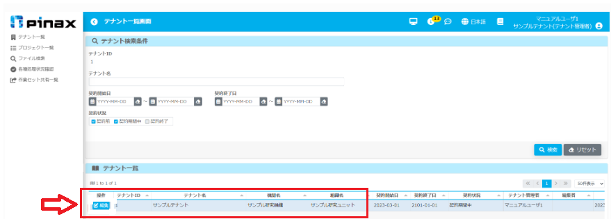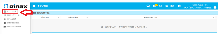1. pinaxにログインし、サイドメニューの[テナント一覧]をクリックし、テナント管理画面にアクセスします。